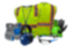 productos de izquierda a derecha: Guantes de piel de vaca con palma reforzada, chaleco de seguridad de alta visibilidad para topógrafos, protectores auditivos, gafas de seguridad con almohadillas de goma para la nariz y puntas de las patillas, guantes de alta visibilidad con recubrimiento de Nitrilo anti-corte ANSI nivel 3.